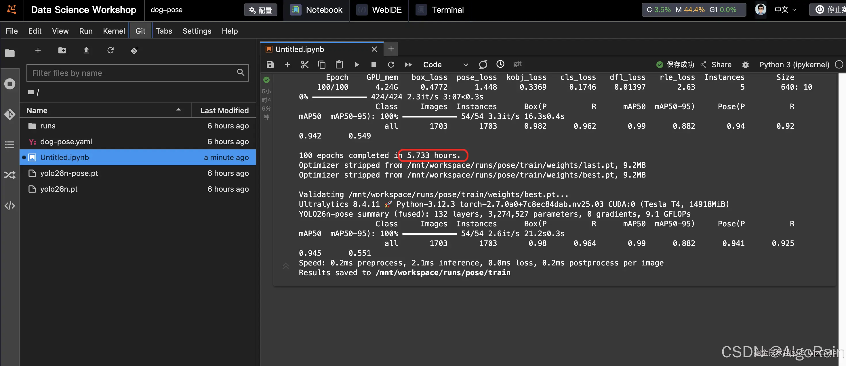 跑完全部训练大概5.7小时,加上安装依赖环境和oss数据集上传,差不多六个小时才完事,导出runs中的best模型就可以