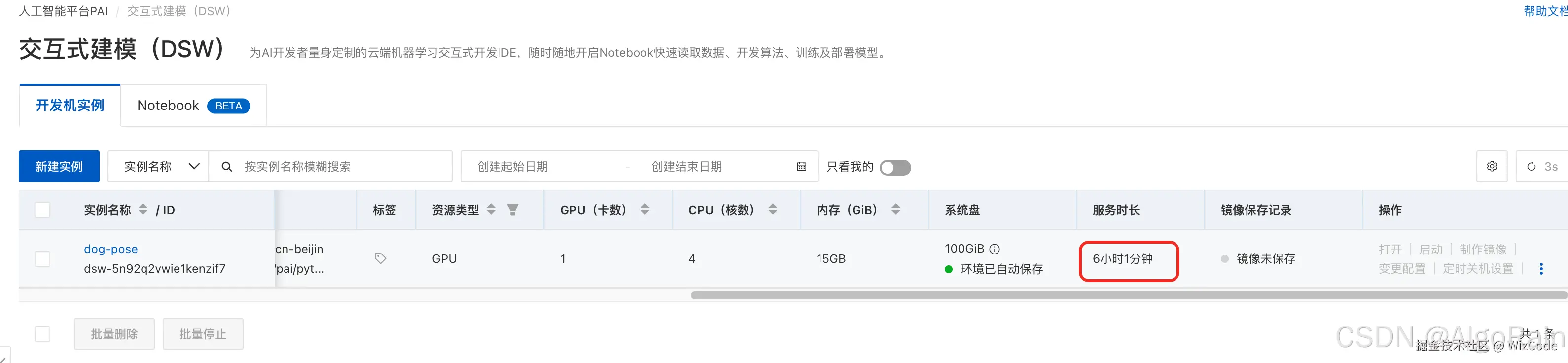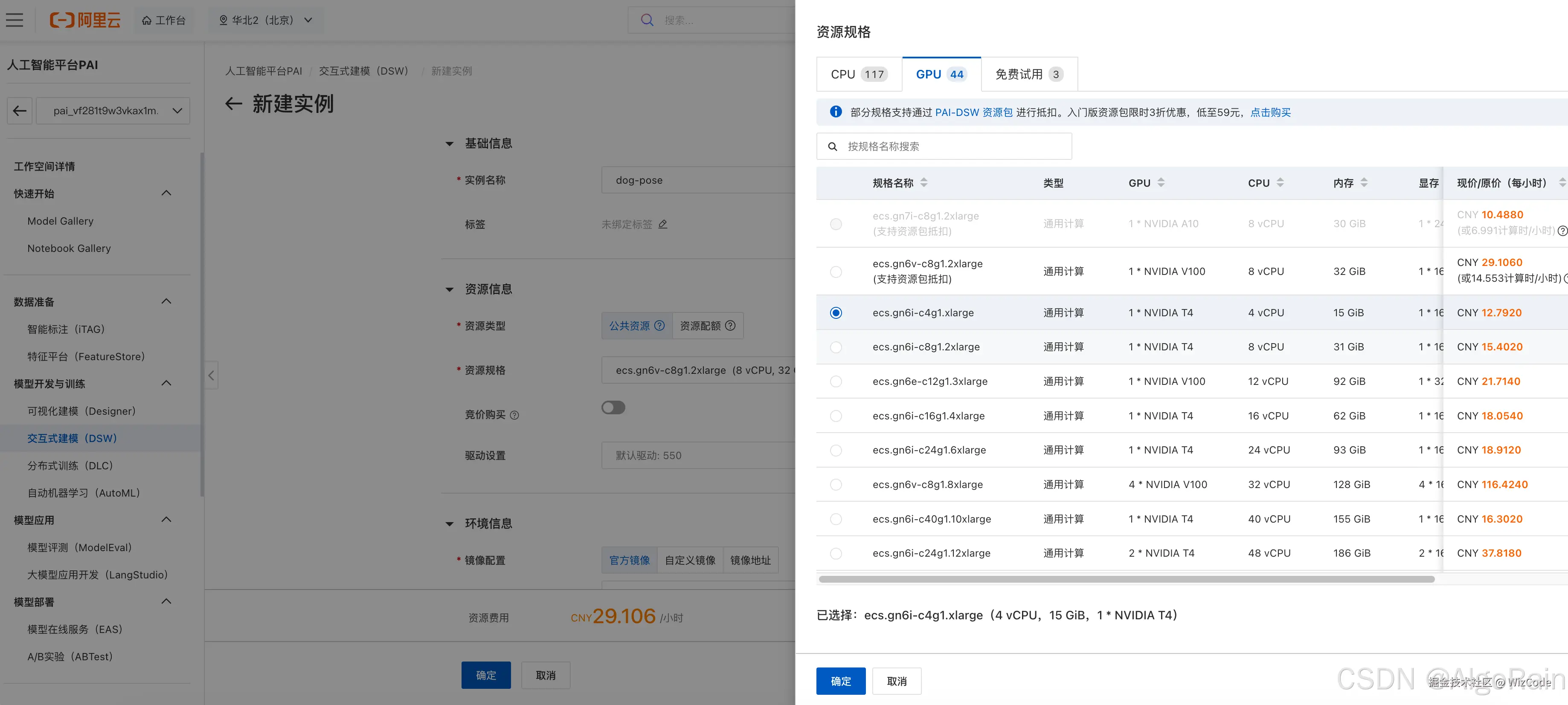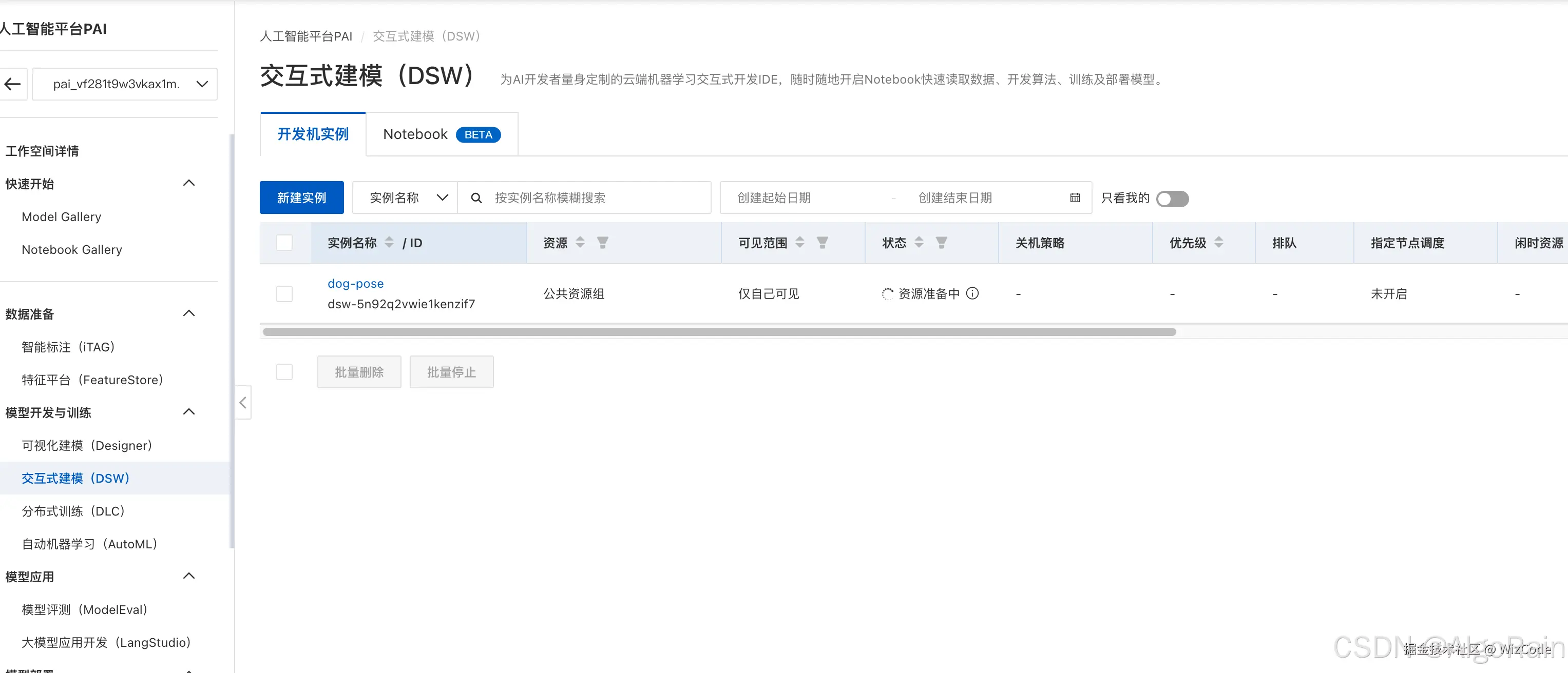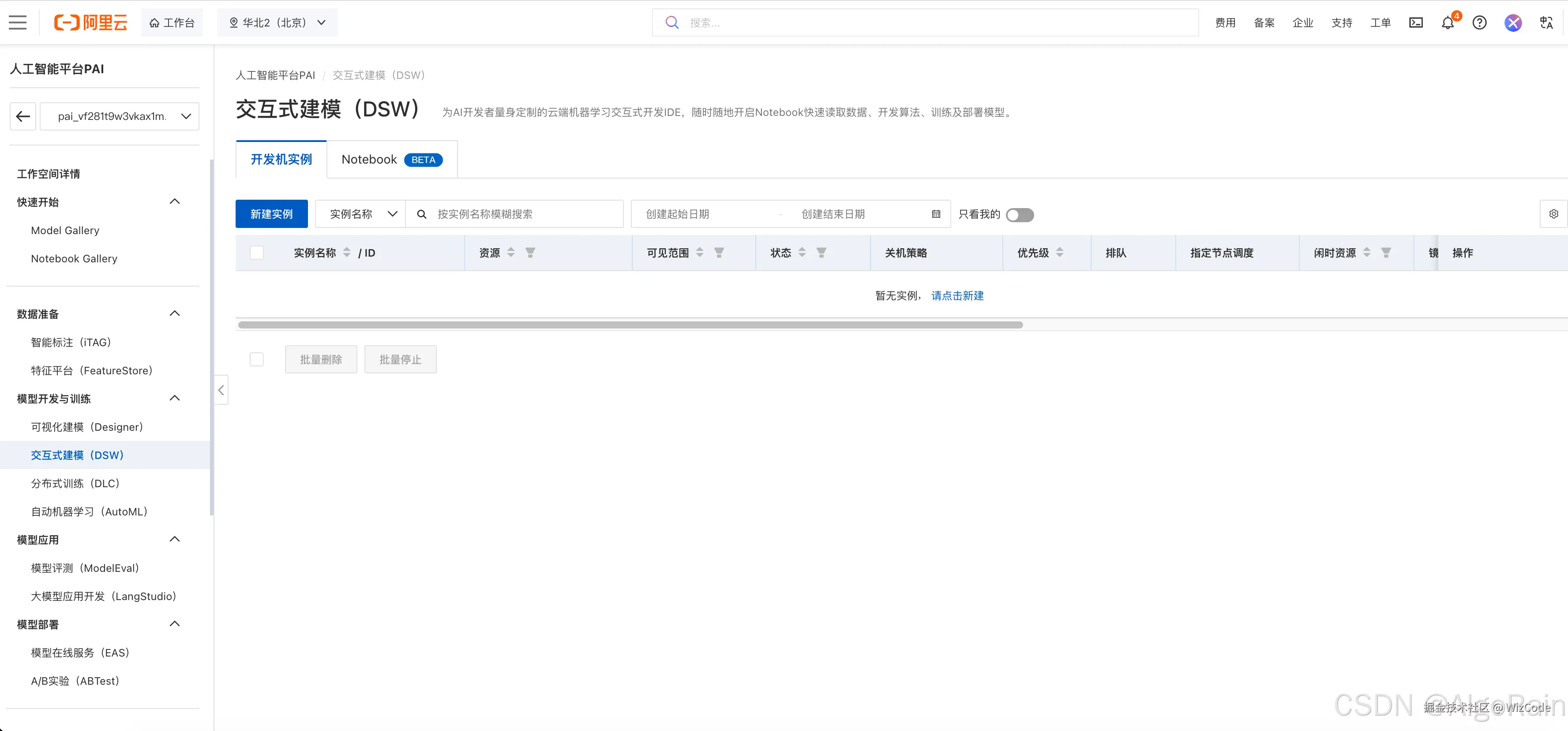 首先在人工智能平台PAI中新建交互式建模的实例