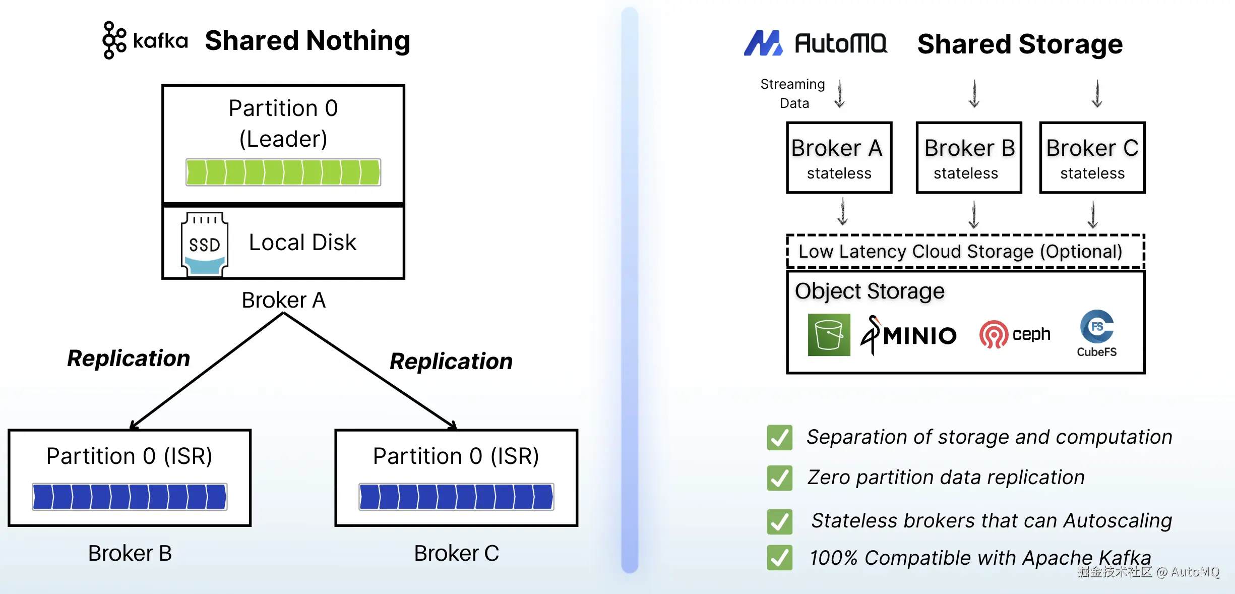 AutoMQ 是市场上唯一一款原生运行在云对象存储之上的低延迟、无盘化 Kafka 平台。针对 Apache Kafka 在云原生时代面临的高成本、弹性差及运维复杂等顽疾,AutoMQ 在保持 100% 兼容 Kafka 协议的基础上,对存储层进行了彻底的重构。 通过采用计算与存储完全解耦的共享存储架构,AutoMQ 将 Kafka Broker 转变为无状态的计算节点。这一设计使企业能够在不牺牲性能的前提下,充分利用对象存储的可靠性与成本优势,并支持包括安全的BYOC以及自托管软件在内的多种部署模式。