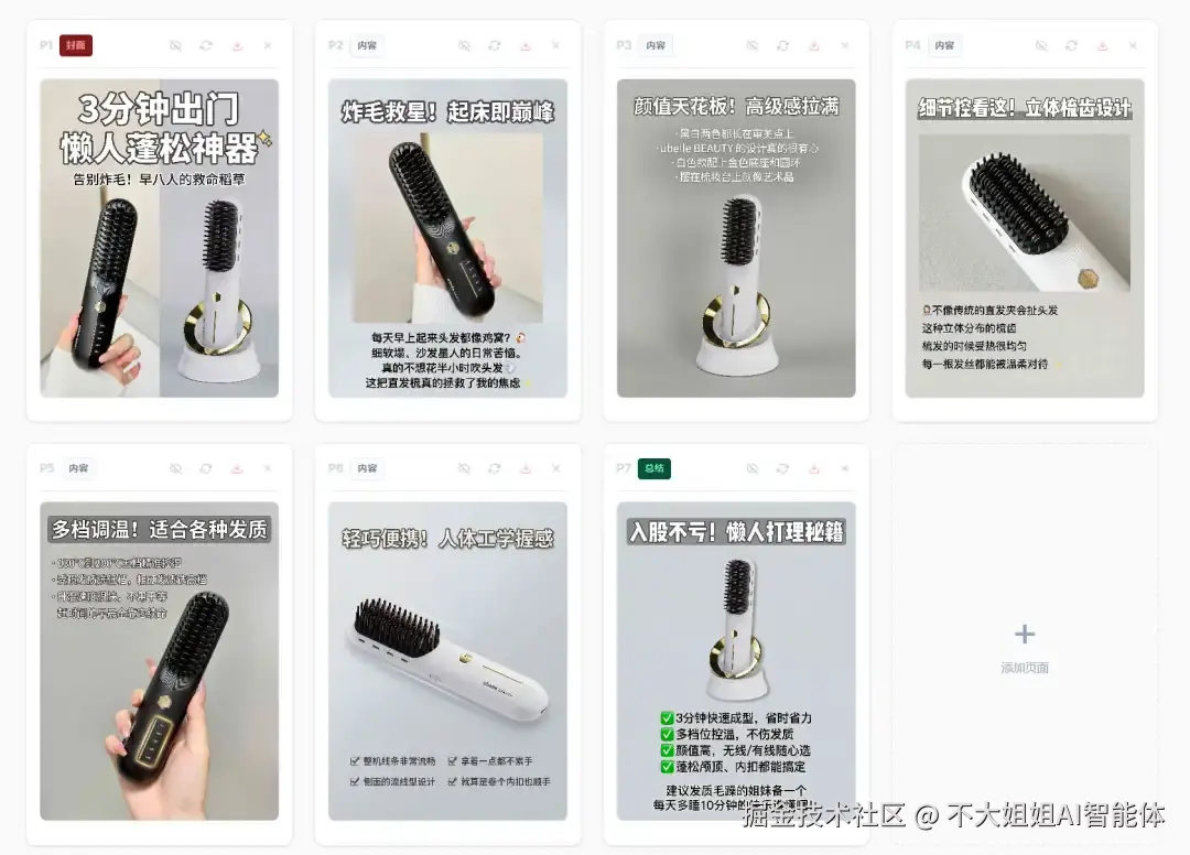 第二步:生成对应的标题、正文以及每一张图的图片描述。 它会自动帮你把 9 宫格的每一张图要放什么文字、配什么背景都规划好。你会发现,连图片上的花字排版,它都想清楚了。