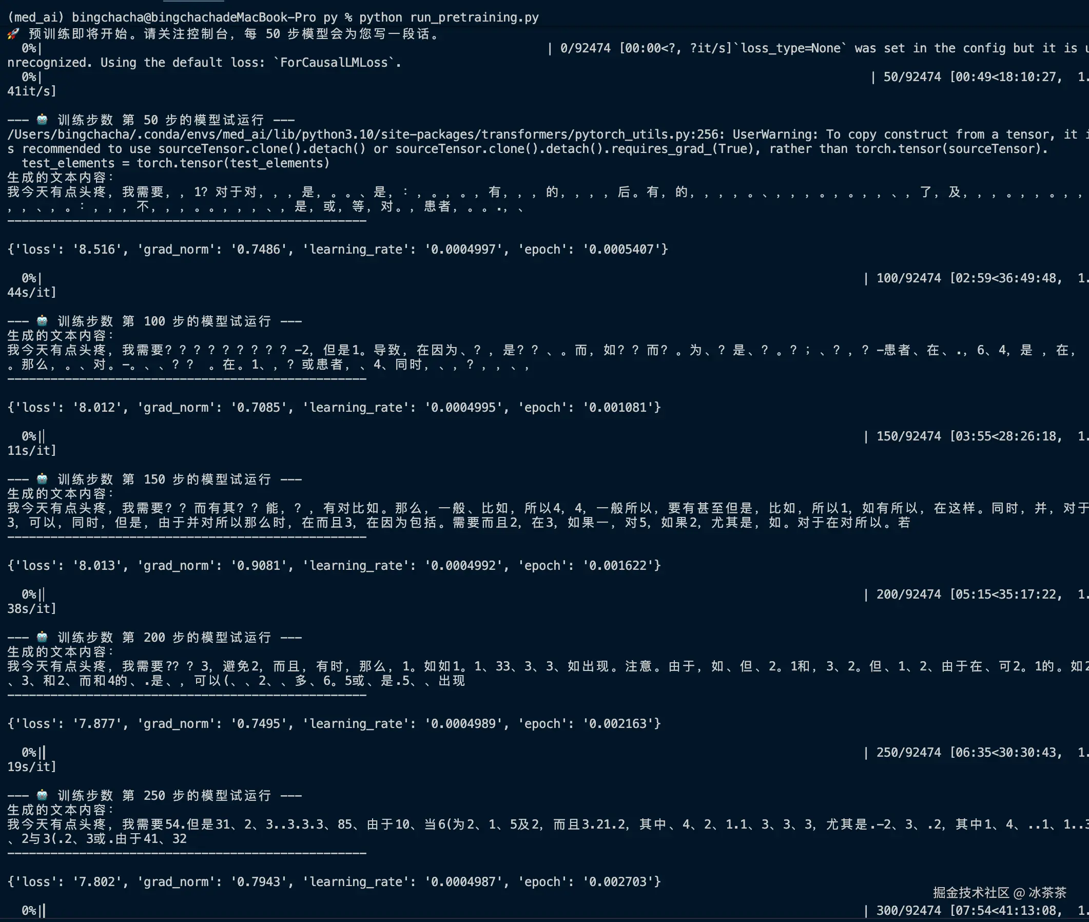 我们调用 transformers 库,设置好合适的参数后,即开始进入漫长的预训练过程。