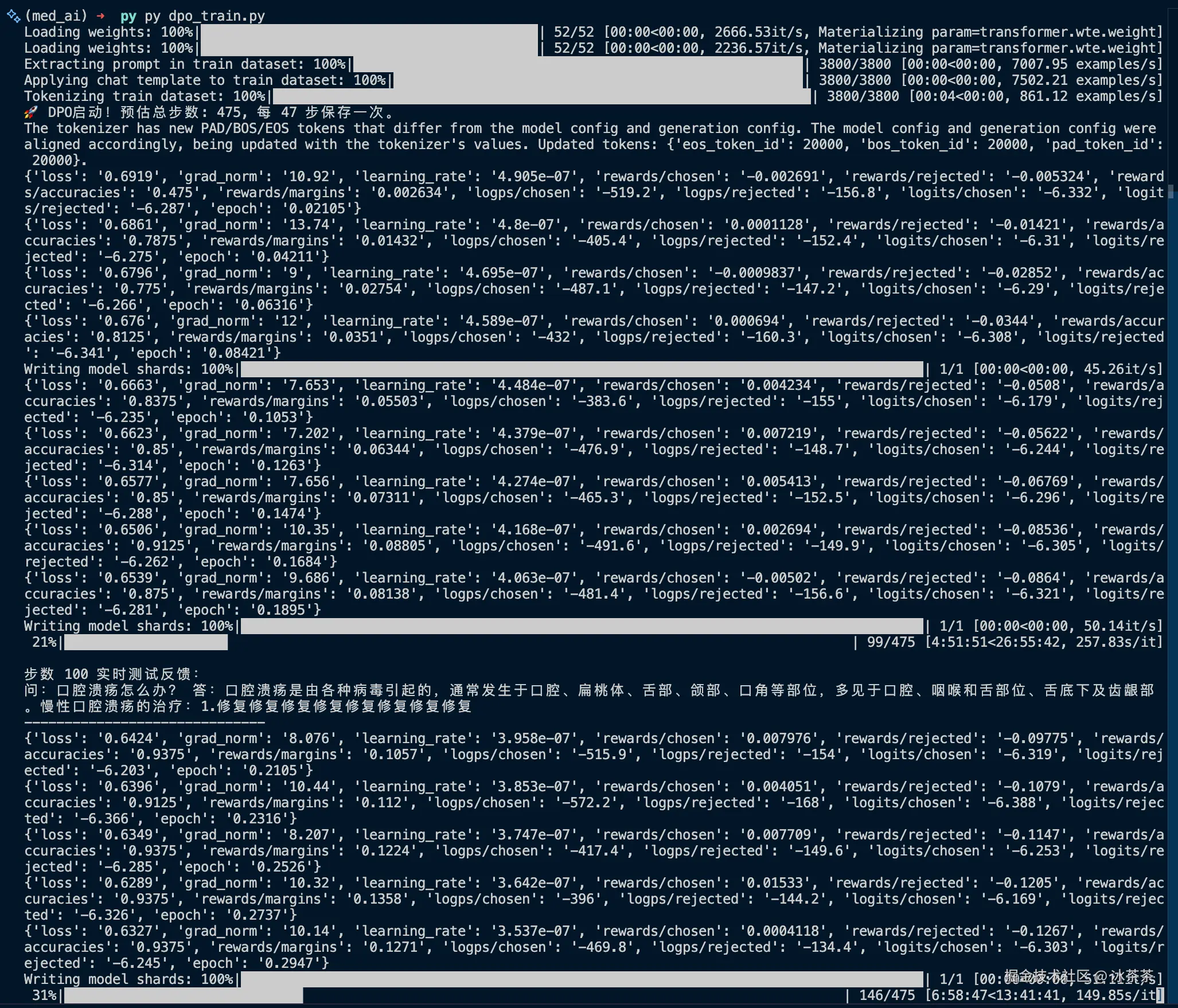 看相关的参数我觉得我们这个小模型对好坏的认知已经基本定型。所以我最后决定不继续等待,而是拿最新的第**141步的checkpoint**文件作为 DPO 的训练结果,也作为我们这个「医疗大模型」的最终成果。