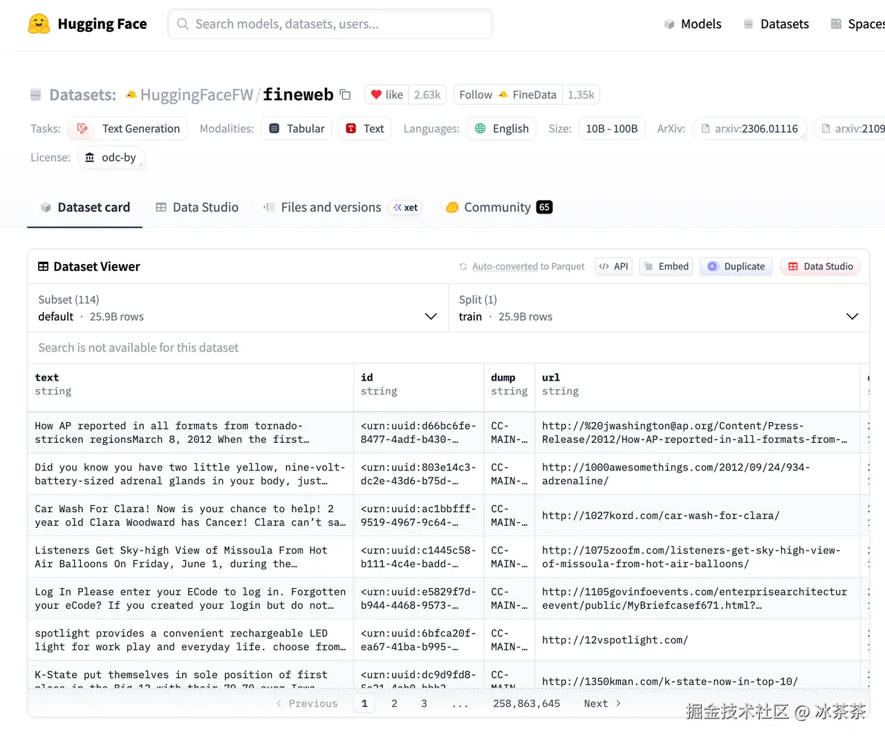 但是现在优秀数据集并不难得到,比如 Huggingface 上的 FineWeb 项目(huggingface.co/datasets/Hu… 18.5T tokens,它们经由爬虫(Common Crawl)爬取数据并且做了一定的清洗,你可以很容易地就下载到其中的某些数据分片甚至是全量的数据,但真正的问题在于大多数人根本没有对应的算力资源去对如此海量的数据进行计算。