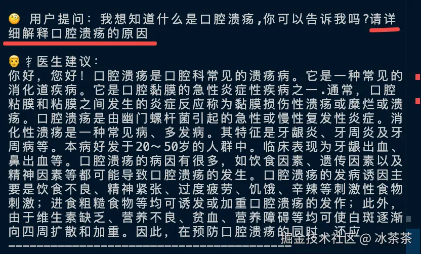 现在我们拥有了一个基础模型(Base/Foundation Model),但是目前的这个模型只会进行数理统计意义的词语接龙,虽然我们可以调整各种参数让它每次的输出结果不一样,但是它目前还学不会问答这套逻辑,而且只能基于医疗数据回答,让我们写个脚本测试一下: