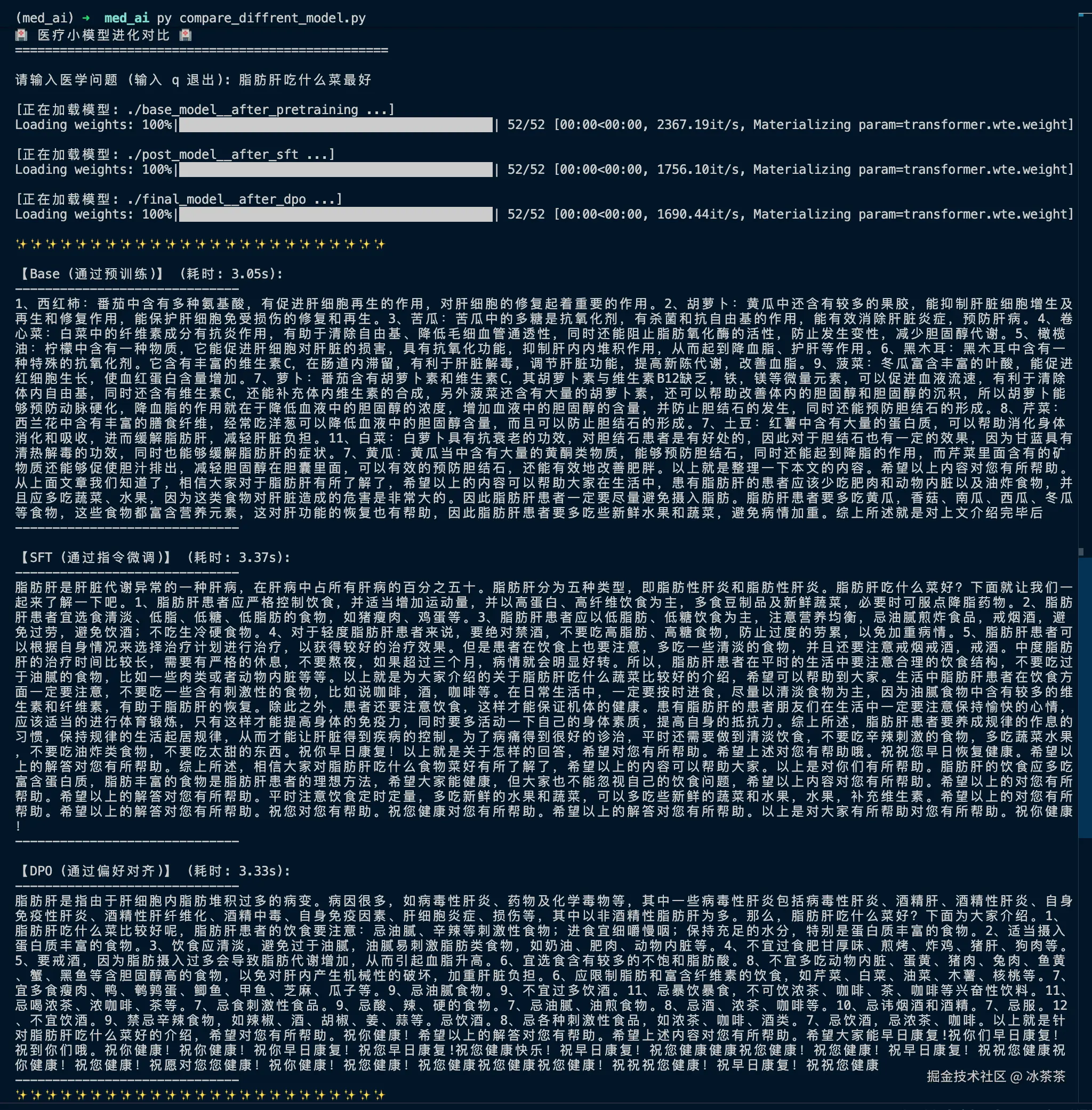 我们采取最直观的方式来分析结果:写一个脚本,它用于加载不同步骤生成后的共计3个模型:预训练生成后的模型、SFT后生成的模型、DPO后生成的模型,我们只需要在命令行打一个问题,下面就会自动出现三个模型生成的回复以便进行比较: