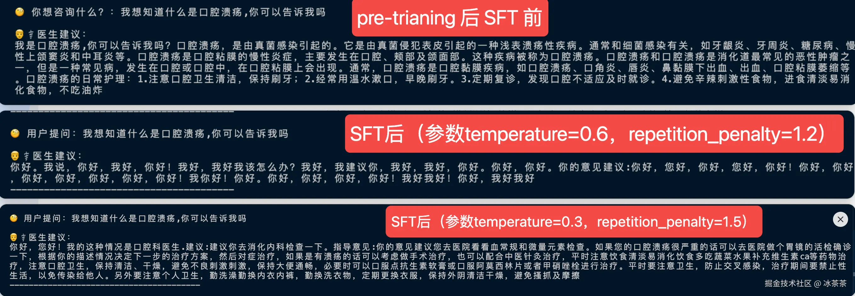 现在这个经过 SFT 的模型的确超越了字词接龙的门槛,但是对于「我想知道什么是口腔溃疡,你可以告诉我吗」这同一输入模型的不同表现,我们也可以看出在SFT后的答案没有SFT前的好: