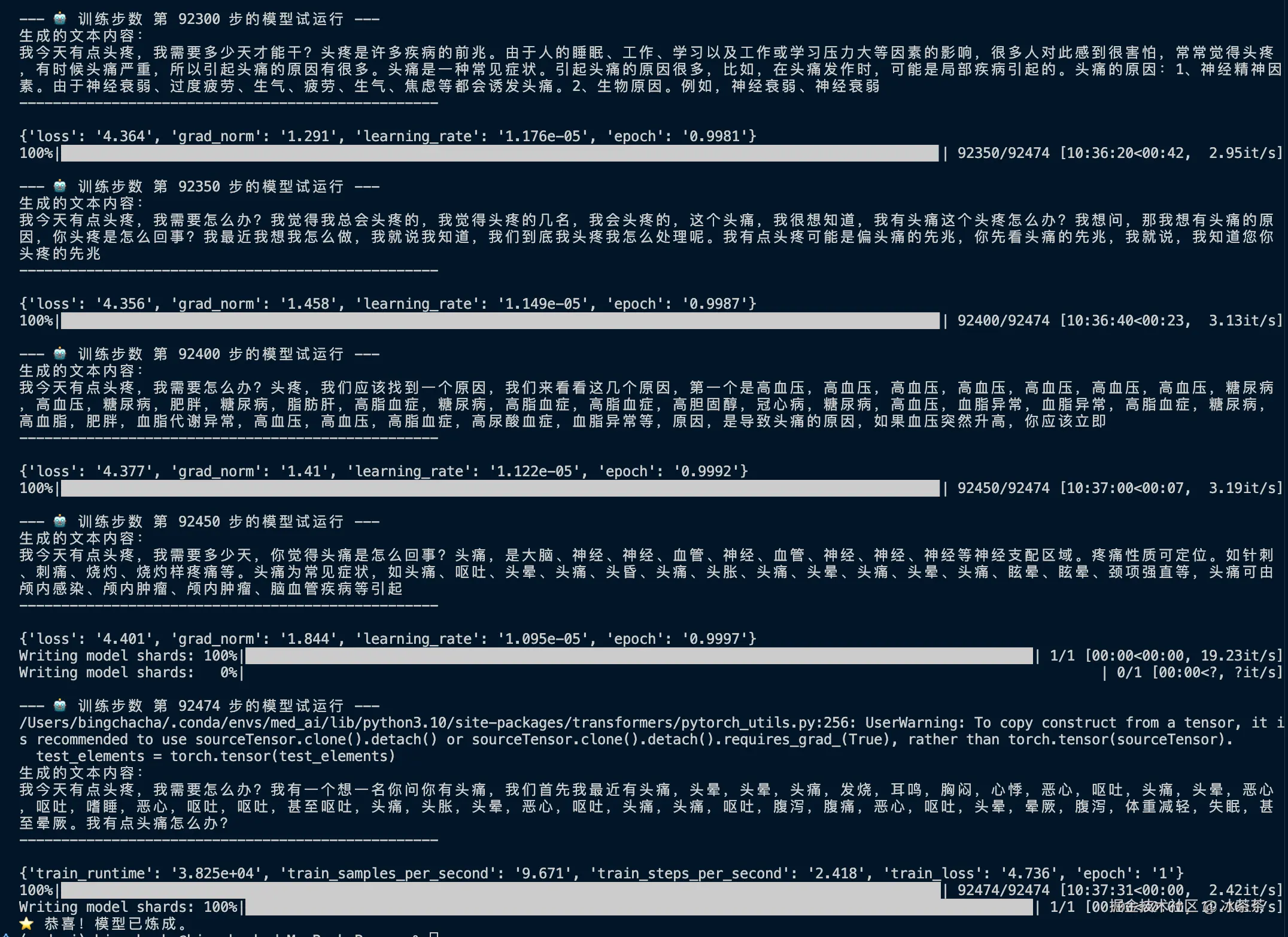 另一方面,每隔50步我就会让模型以「我今天有点头疼,我需要」开头让它进行续写,以便能够实时看到训练成果: