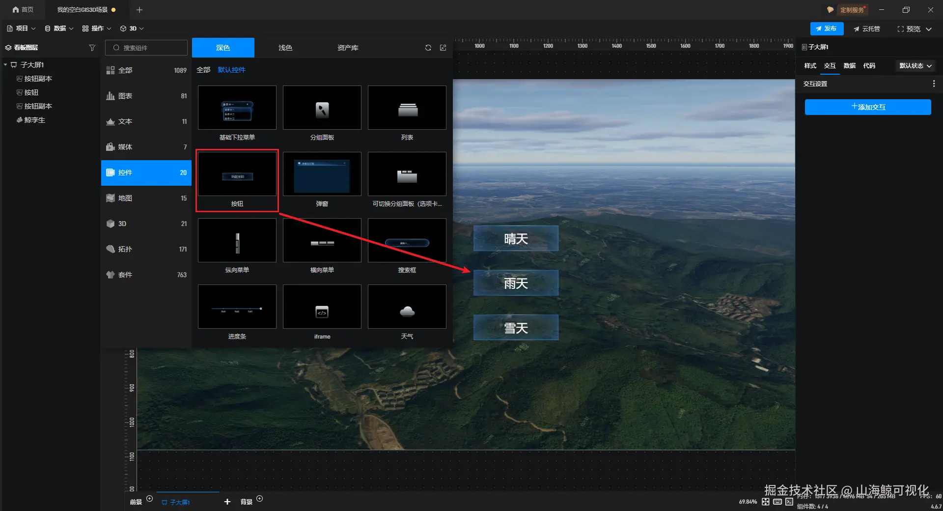 【山海鲸实战案例】通过二维组件控制三维场景天气变化 山海鲸可视化 2026-02-04 28 阅读1分钟 在项目制作过程中,我们可能会需要手动控制三维场景的昼夜切换,此时通过按钮组件的交互设置就可以非常简单地达到目的,下面我们就来看一下具体该如何进行设置。 首先,创建一个三维场景。 添加三个“按钮”组件,分别命名为 “晴天” 、 “雨天” 和 “雪天” 。 接着选中 “按钮” 组件,点击右侧 “交互” 按钮为其设置交互。 三个按钮的 “天气选择” 设置项分别对应 “无天气” 、 “下雨”和“下雪” ,如下图所示: 这样我们就完成了通过 “按钮” 组件进行天气切换的设置,如下图所示:
