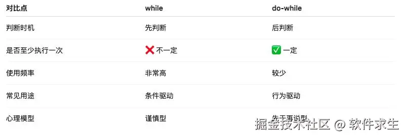 while 是“先看门票”,而do-while 是“先进来再说”