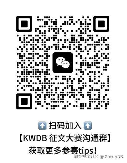 添加征文小助手K小二(微信号:KaiwuDB Assistant2)或扫码加入大赛交流群: