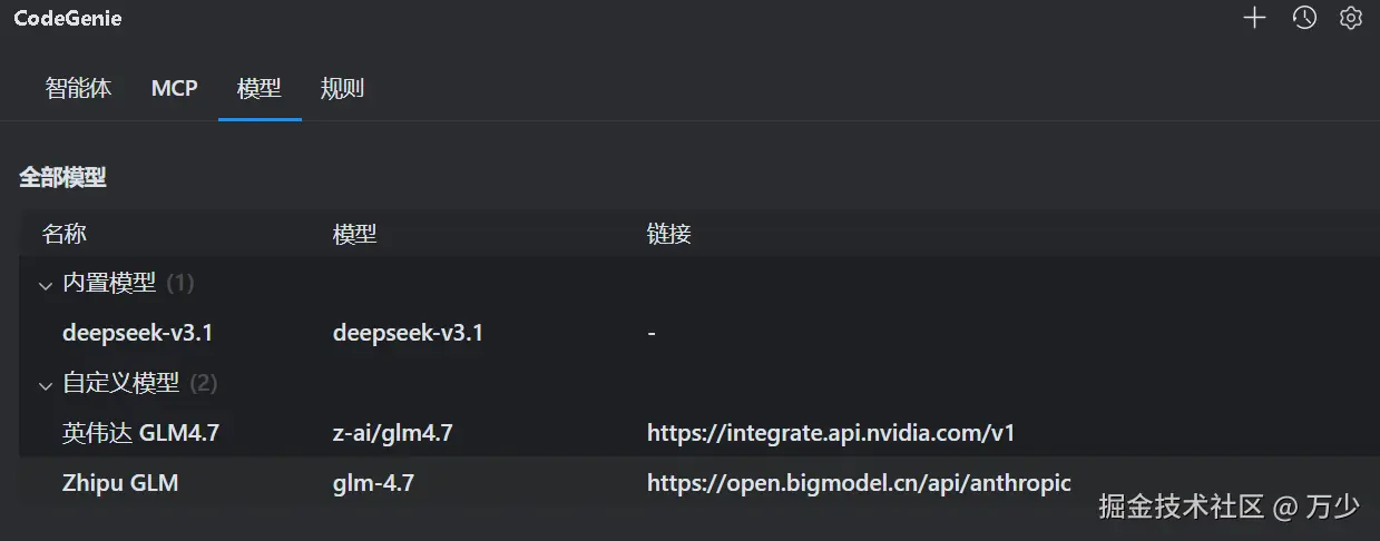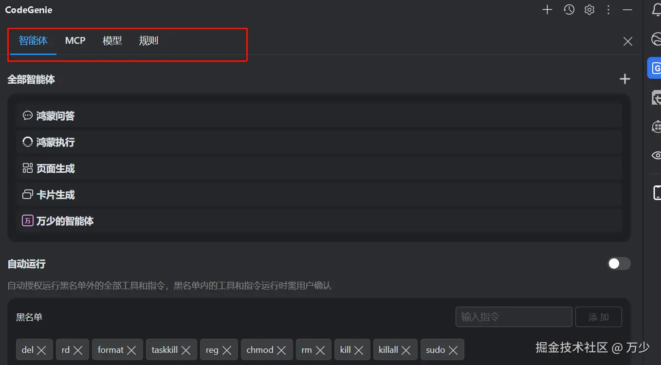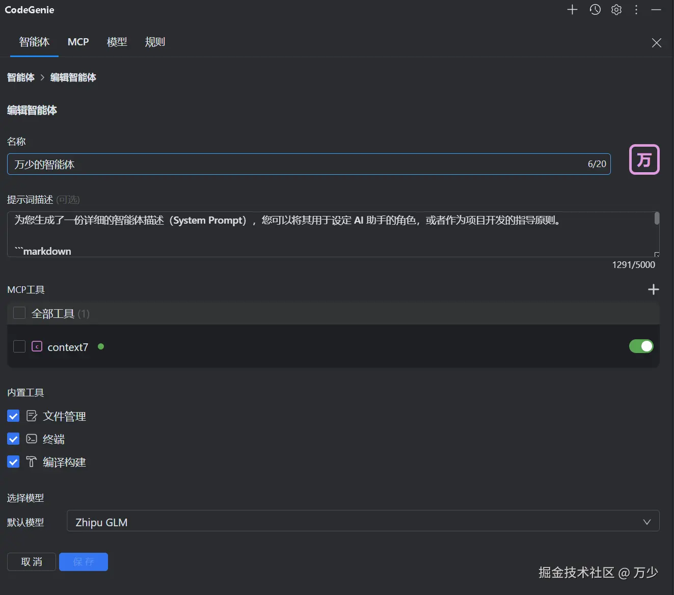 你可以自定义智能体,理解为这个 AI 编程工具的角色是谁即可,文章末尾提供万少的智能体以供参考