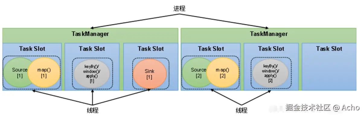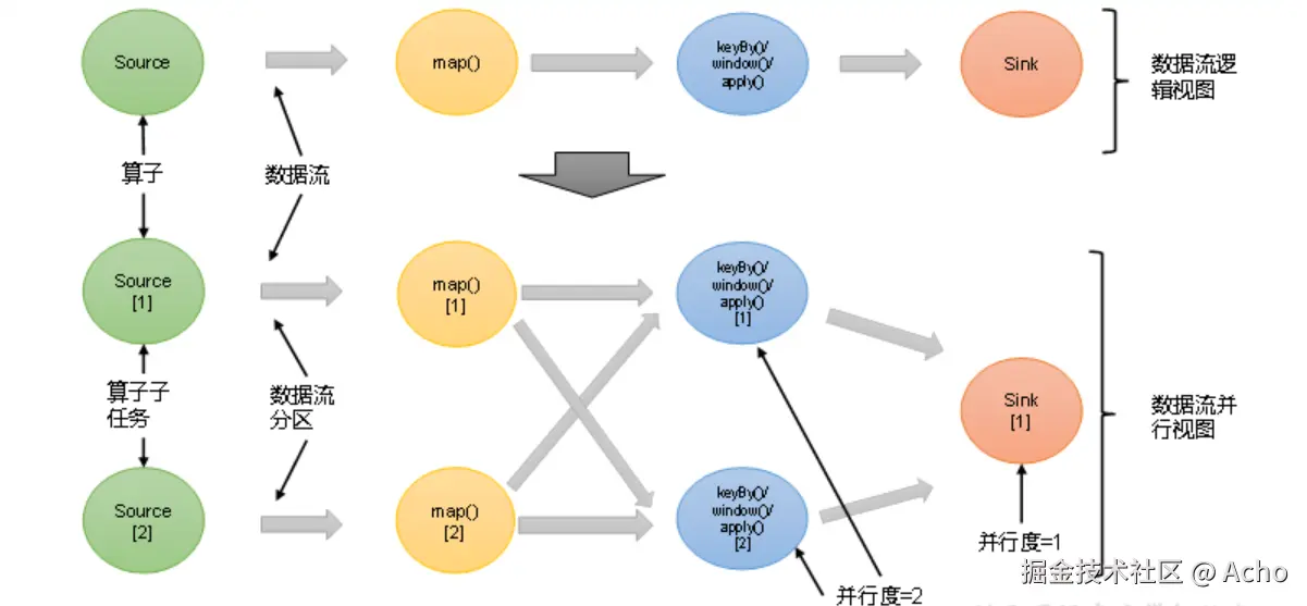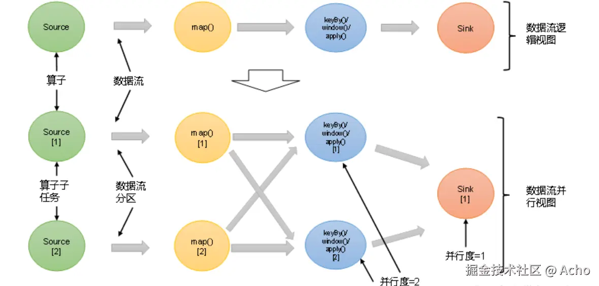 - 并行度 = 8 → 8 个人一起削,理论上快 8 倍 Flink 里每一个算子(source、map、keyBy/window、sink)都可以单独设置并行度。