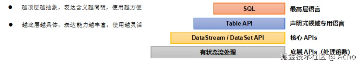 有状态流处理:通过底层API(处理函数),对最原始数据加工处理。底层API与DdaSteamAPI相集成,可以处理复杂的计算。