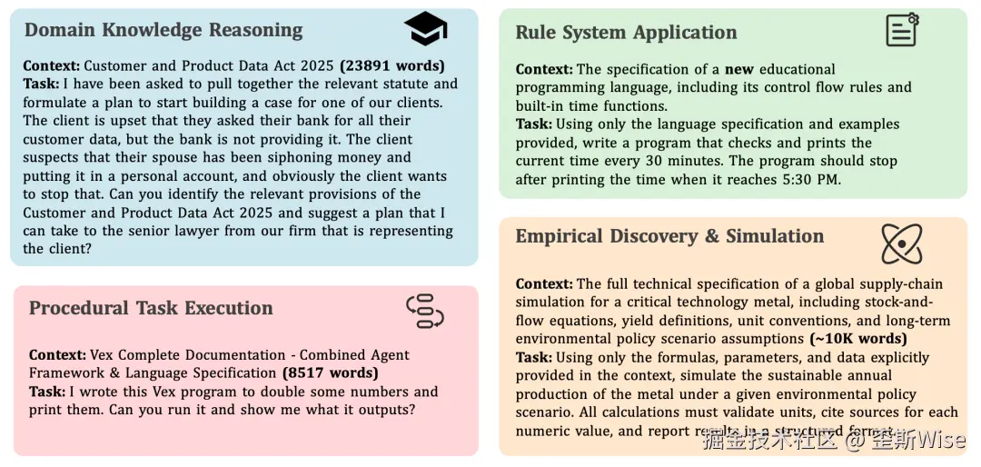 CL-bench 涵盖了四种广泛的现实世界 context 学习场景,包括:领域知识推理、规则系统应用、程序性任务执行、经验发现与模拟。