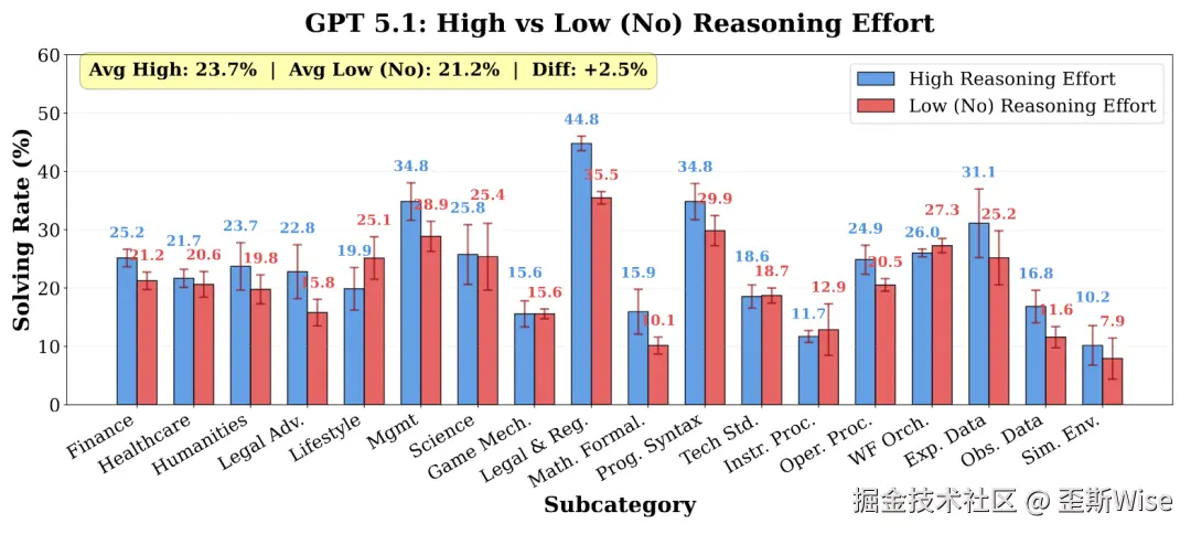 GPT-5.1在管理类和实验数据类任务上,提高推理强度后表现提升了约6%,但其他模型提升有限,甚至可能下滑。