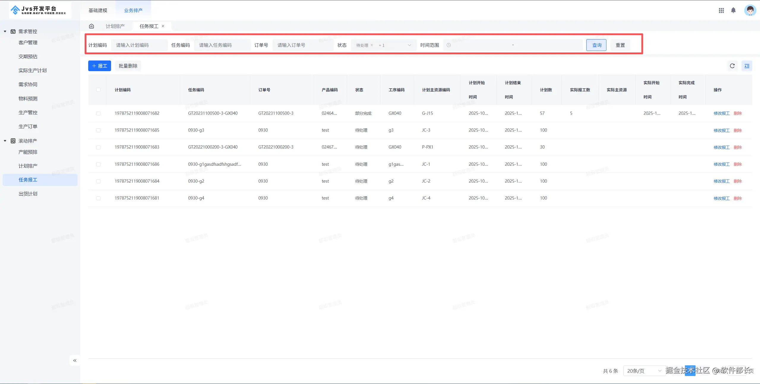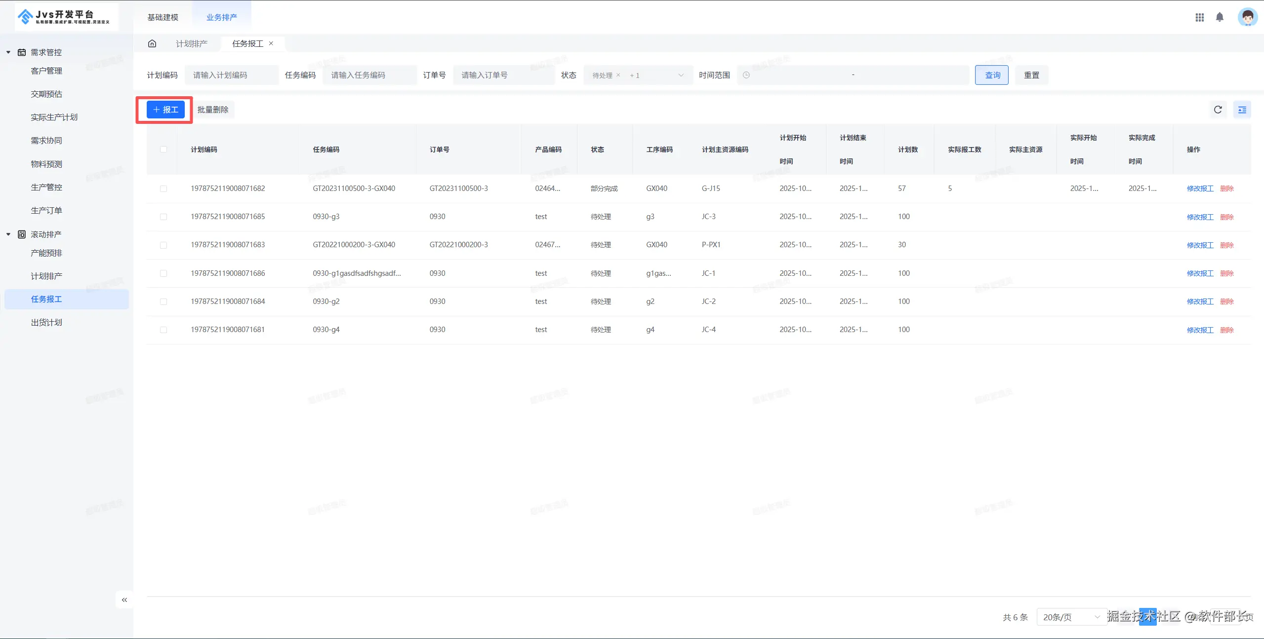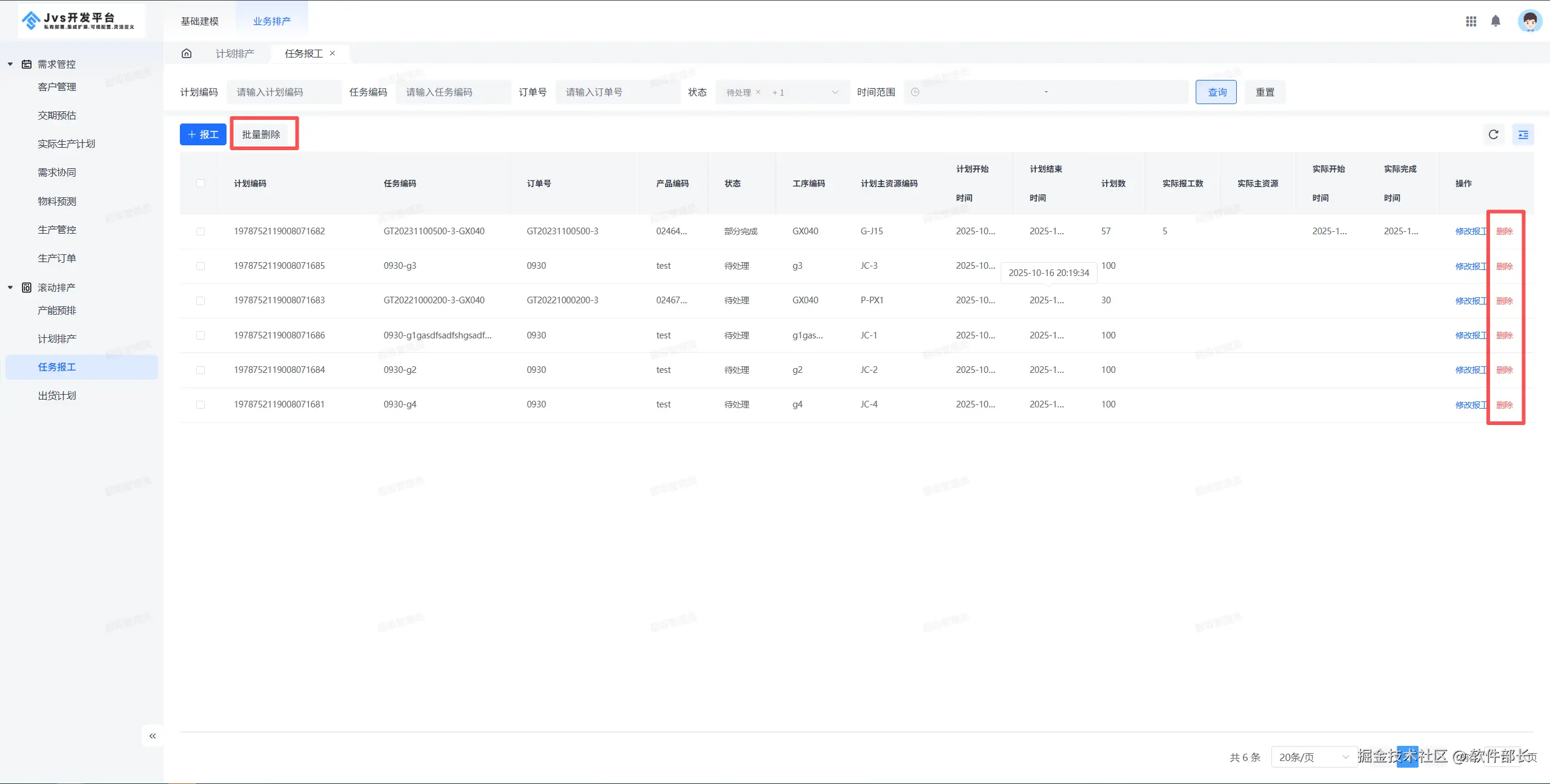 5、可对报工单进行单个删除,也可点击批量删除进行多个删除。