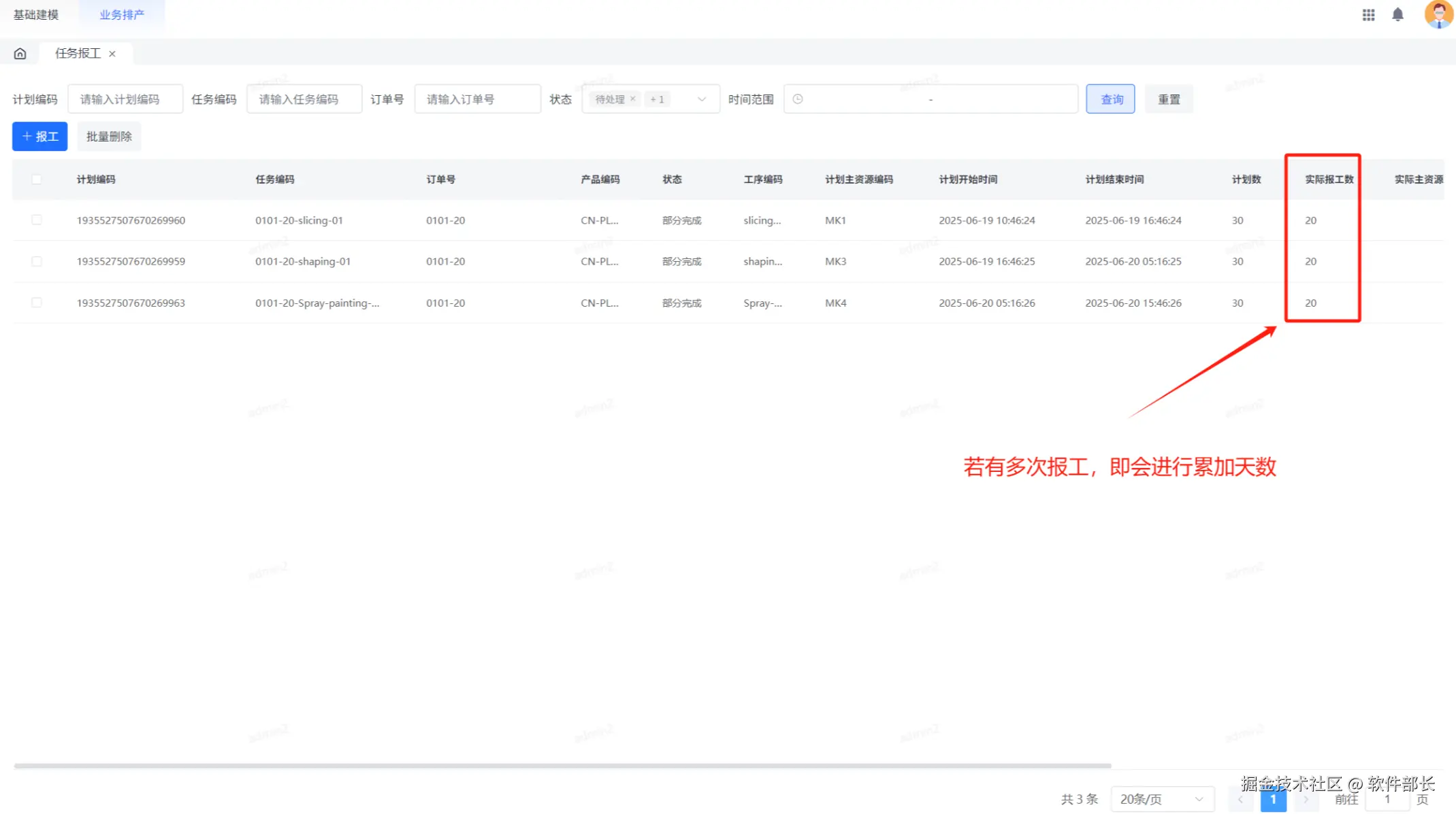 任务报工是指产品成功排产后使用【计划下发】功能,将相关排产任务下发到车间后,对任务完成情况进行反馈的过程。这些任务会出现在任务跟踪列表中,管理人员可对任务进行上传新增报工,也可手动修改报工。