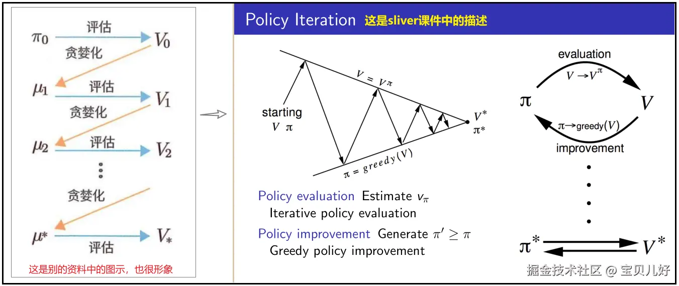 策略迭代算法(policy Iteration)包括策略评估和策略改进两个步骤。在策略评估中,给定策略π1,用不动点原理迭代计算π1策略下每个状态的价值函数vπ1-->由vπ1算得qπ1-->策略改进:用贪婪方法找到当下最好的qπ1(就是argmax a)-->当下最好的qπ1又对应着新策略π2-->用不动点原理迭代计算π2策略下每个状态的价值函数vπ2->qπ2->贪婪化选择最好的qπ2->策略π3->....如此循环下去,就是一个策略收敛的过程。直到价值值不变、策略不变,这个策略就是最优策略π*。上述迭代过程一般都能收敛到最优策略。