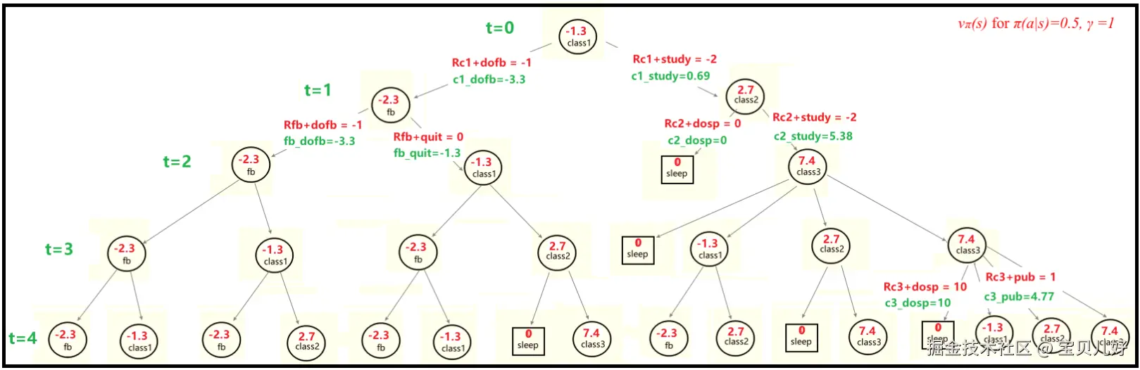 如果当这个小学生现在在fb状态,他选择study动作、往class1状态走,就能获取更多的奖励。