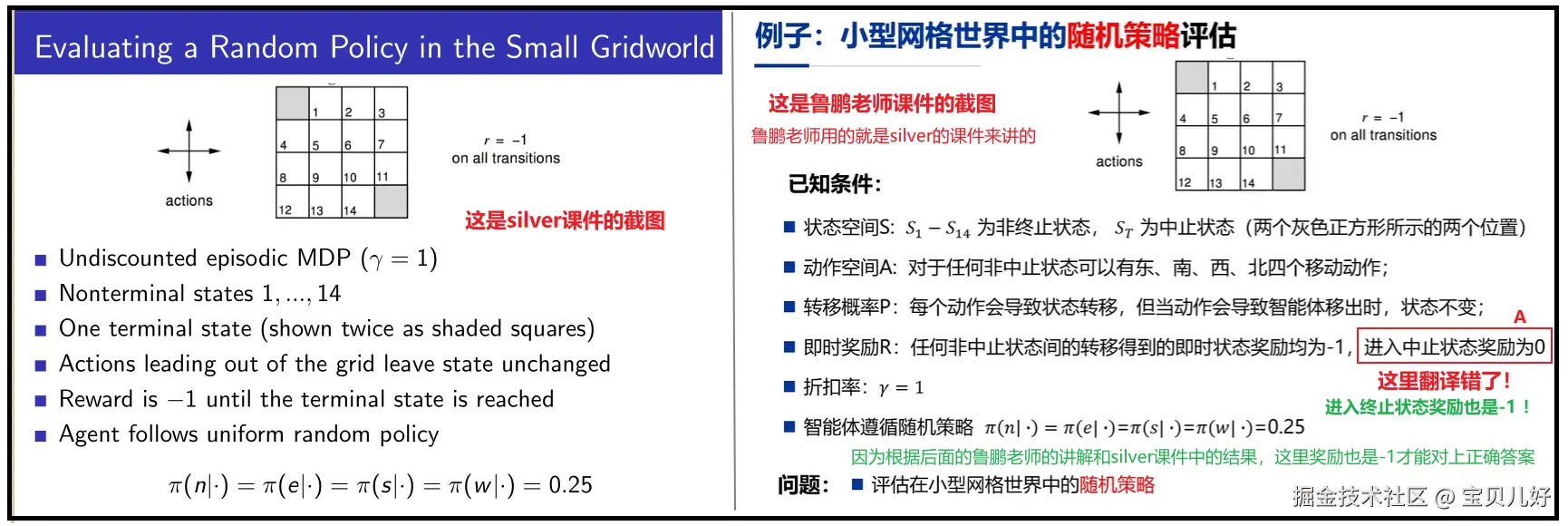 上面的4行4列格子中,左上角和右下角格子是逃生门。意思就是一个agent被放置在这个小型网格中,如果这个agent移动到这左上和右下格子中就逃生了,游戏就结束了。所以左上和右下格子就是终止状态格子。