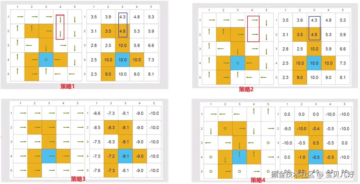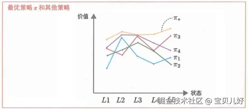 对于π1、π2、π3、π4来说,没有一个策略的所有状态值都大于其他策略的。所以策略π1、π2、π3、π4没有优劣之分。对于π* 策略,他的所有状态值都大于(π1、π2、π3、π4),那么π* 策略就优于(π1、π2、π3、π4)。