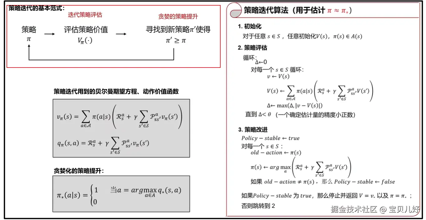 (2)至此我们就得到策略迭代的基本范式、计算公式、算法实现: