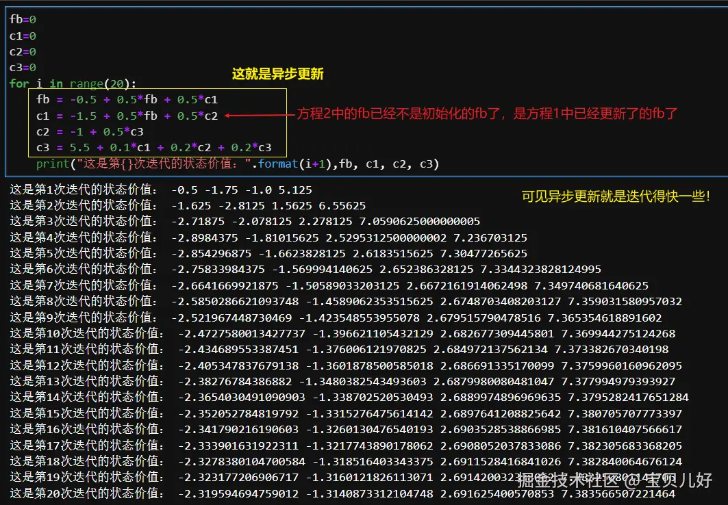 上面求解状态价值的过程,在算法的工程实现上叫同步更新(同步DP),意思就是迭代一轮,就更新一次全部的状态价值。下一轮迭代时,就依据这次的结果重新更新全部的状态价值。
