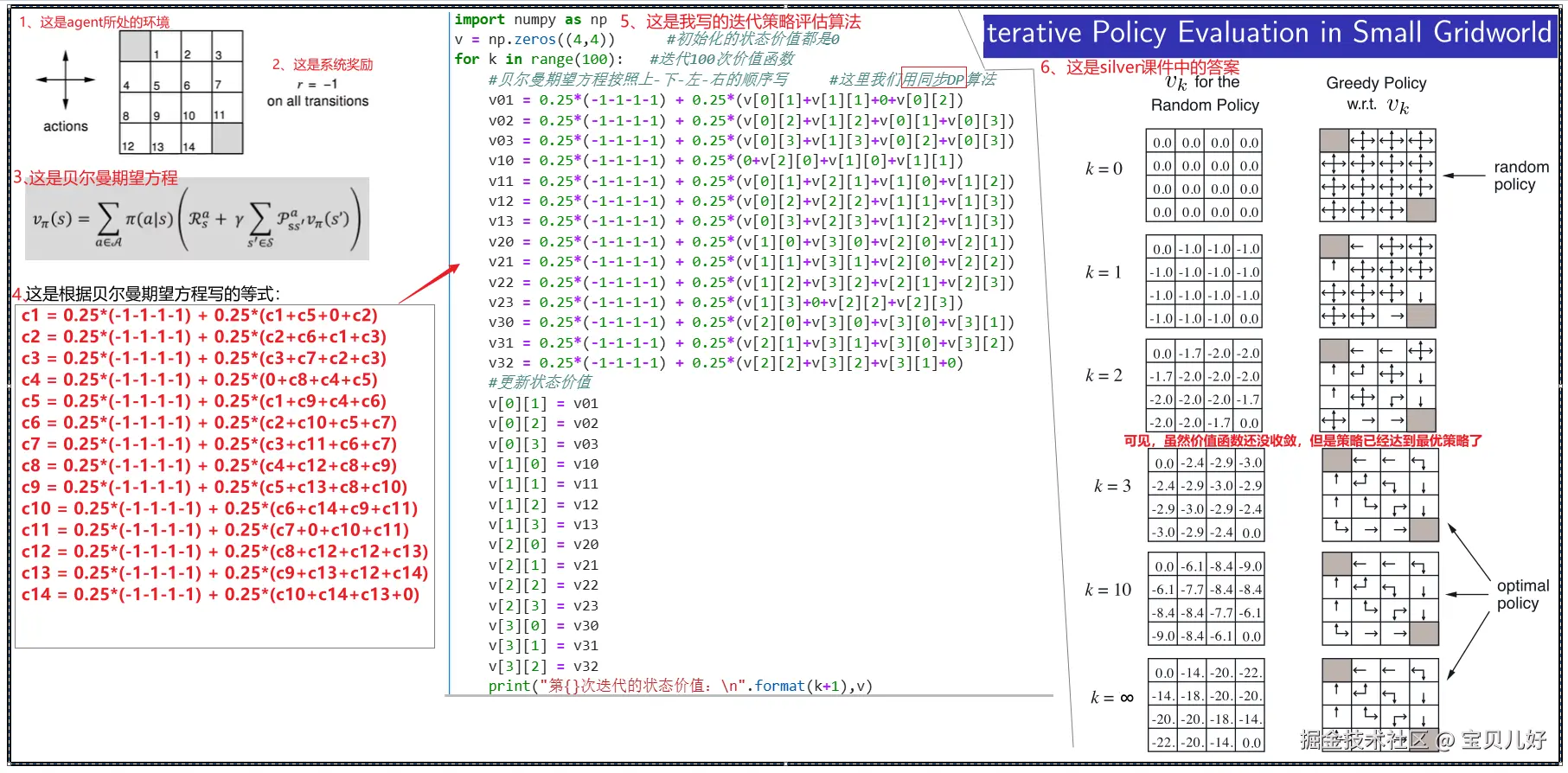 这里我先不绕理论和罗列数学推导,我先用上一篇中的学生例子为例,给大家展示一下是如何进行策略评估的,让大家先有一个直观的认识:(1)首先要声明的是,上面的迭代结果是正确的,因为和silver课件中的结果是一样的!说明计算正确!