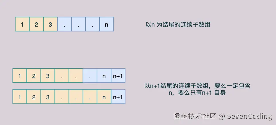 假设现在有 n 个元素,突然加上⼀个元素,变成 n+1 个元素,对连续⼦数组的最⼤和有什么影响呢?