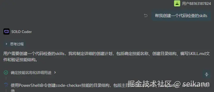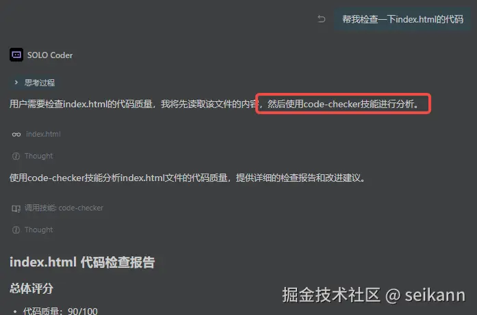 当我提问帮我检查代码时,AI自动调用刚刚创建的code-checker skills