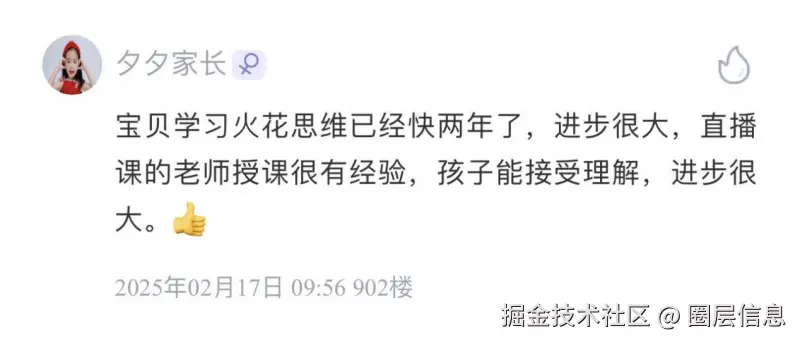 “火花思维现在成了嘟嘟绝对不能停掉的一门课程,其他的课程可以停,但嘟嘟说火花思维不行,孩子非常坚持。只有在孩子真正喜欢一门学科并愿意去学的情况下,我才愿意为他报名。“