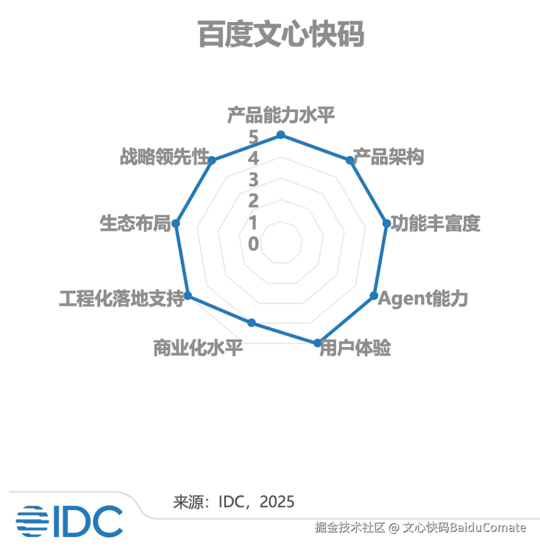 2025年6月,国际权威评测机构IDC正式发布了《中国市场代码生成产品评估》,国内市场10家头部代码生成头部产品参评。在本次评估中,百度智能代码助手文心快码脱颖而出,斩获3项第一: