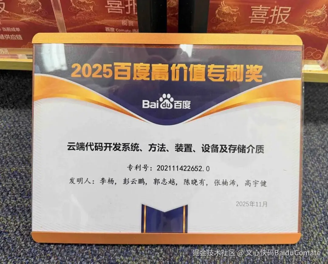 2025年,凭借核心技术成果“云端代码开发系统、方法、装置、设备及储存介质”,荣获“百度高价值专利奖”。 该奖项体现了百度在AI开发工具领域持续投入所形成的技术壁垒与知识产权优势。