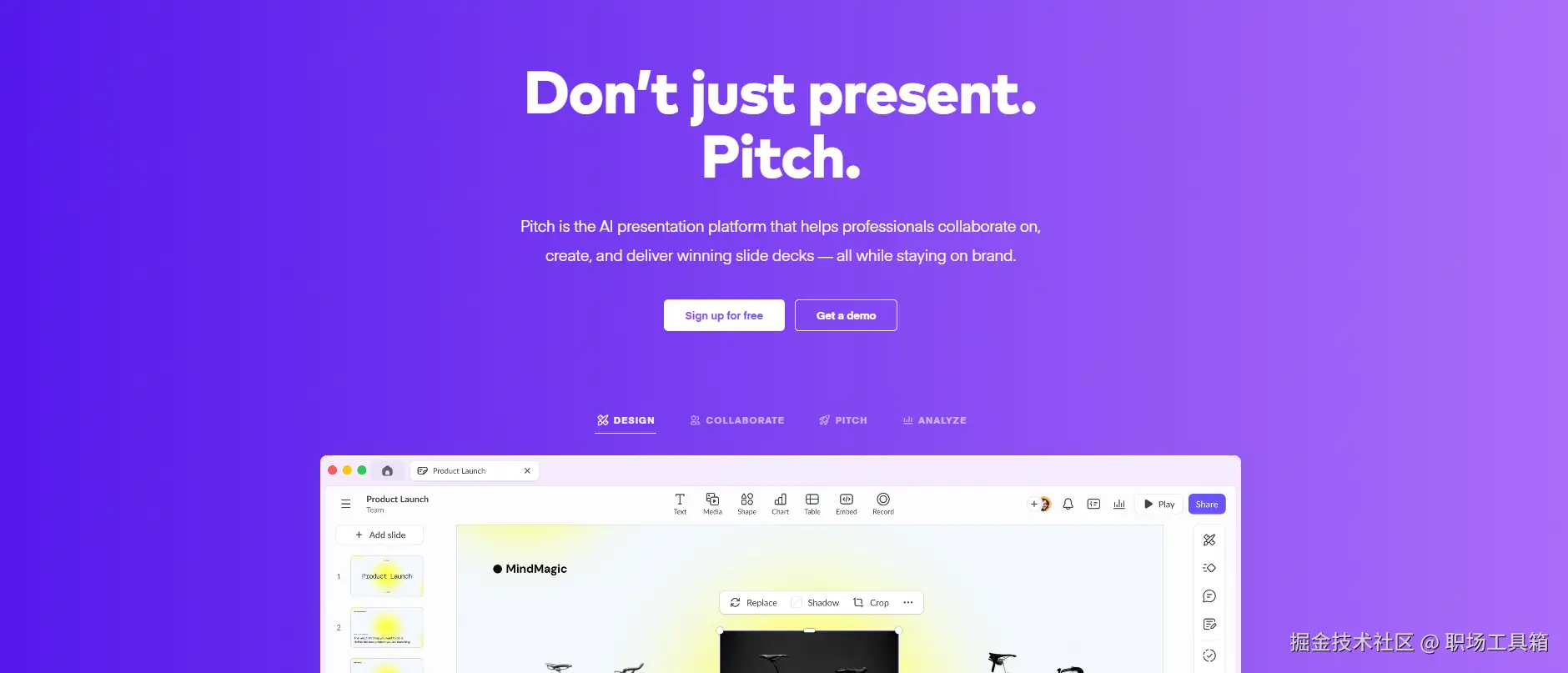 Pitch定位高端,主要服务企业用户。它的设计理念是把PPT制作从个人任务变成团队协作流程,强调版本管理、权限控制、分析追踪等企业级功能。