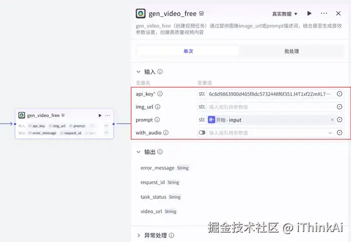 此为免费生成视频的插件节点,需从智谱AI获取API Key填入参数api_key。