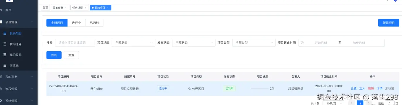 盯着这个界面,我第一反应是 “太完整了”:首页的 “项目总数”“任务总数” 卡片带着统一的图标样式,数字会随后台数据同步更新;右侧的任务状态环形图自动统计 “进行中”“待确认” 的任务占比,连图例颜色都做了区分;点进 “我的项目” 页面,搜索框、项目状态下拉筛选、“新增项目” 按钮一应俱全,甚至还加了分页控件 —— 这些都是我原本计划 “如果赶得及再补” 的细节,飞算直接帮我拉满了。更关键的是这些功能不是 “空架子”:我在 “我的项目” 里新增了名为 “来个 offer” 的项目,点击保存后,首页的 “项目总数” 立刻从 0 变成 1,项目详情页里的 “任务总数” 也随着新增任务同步更新,连任务状态变更后,环形图的占比都会自动刷新。