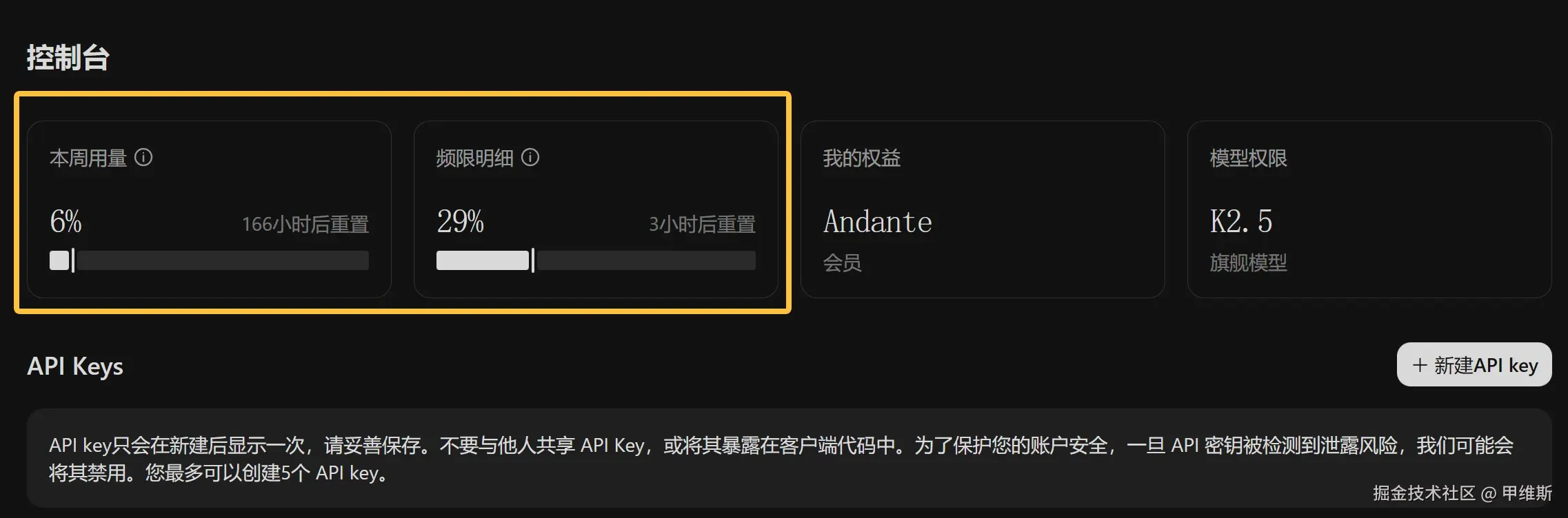 前面都是在第三方平台的接口下测试,肯定有点偏差,所以我直接开了一个 Kimi Code 套餐。