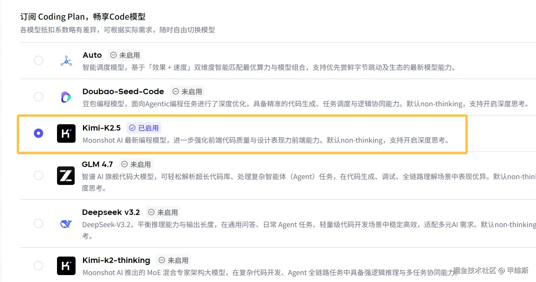 当我想要测试一下 Kimi k2.5 的时候,我首先是去找他有没有 coding plan,找了一圈发现官网只有 API 充值调用。我就不太想充!然后想起来,我有一个火山的 coding plan。里面刚好包含了最新的 Kimi k2.5,所以我就把模型切换成了 Kimi k2.5。