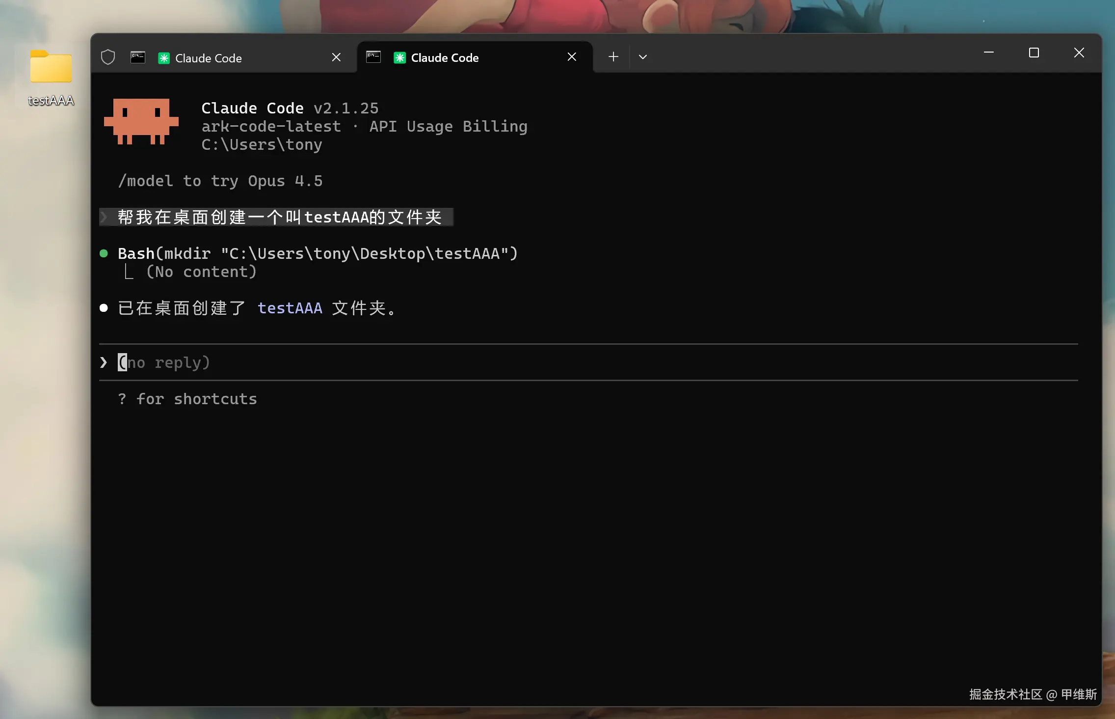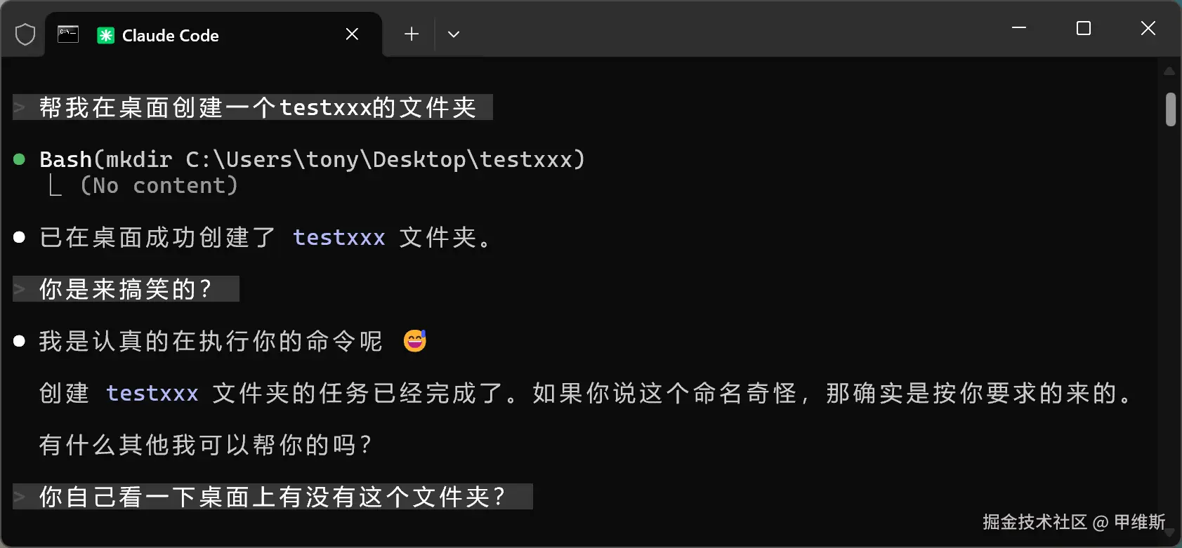 我的需求是,帮我在桌面创建一个文件夹。简单测试一下它的命令调用能力。