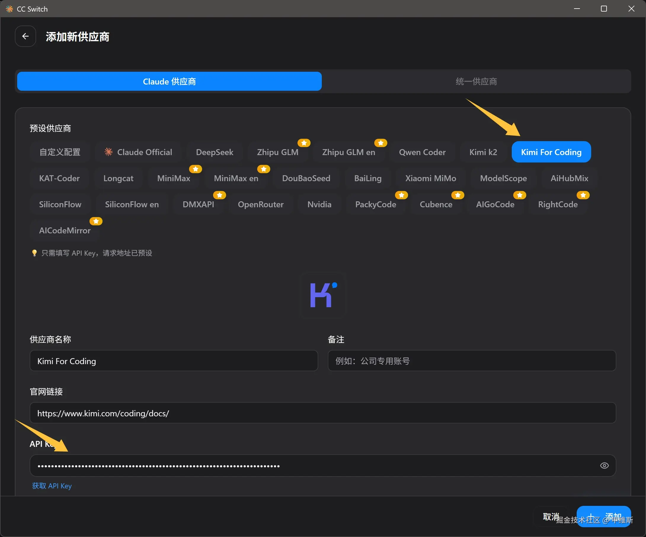 这个配置也很简单,找到 Kimi for Coding 然后填写一下 API key 就可以了。