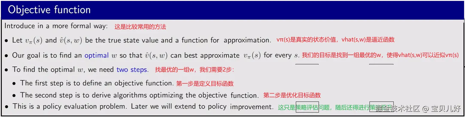 目标函数的形式可以有多种,具体你要选取哪种目标函数是根据你的实际情况决定的。这就类似深度学习中的损失函数,如果你是回归任务,那你的损失函数就得用均方误差;如果你的任务是分类任务,那损失函数就用交叉熵损失;如果你的任务是输出一个分布,那你就得用KL散度来度量损失。同理强化学习也是:(1)上图的objective function1是用真实的状态价值与逼近函数预测的状态价值之间的均方误差的期望作为损失,构建目标函数J(w)。通过求目标函数J(w)的最小值,就可以得到逼近函数v(s,w)的参数,进而可以进行策略评估了。