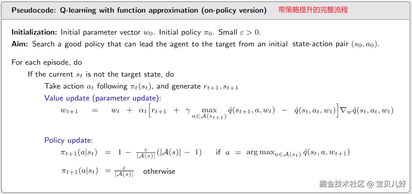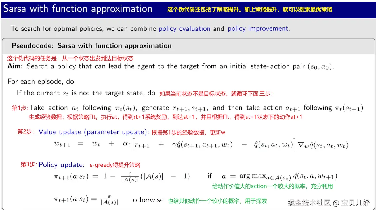 2、下面是Sarsa with function approximation的伪代码。用Sarsa可以直接计算出动作价值,但为了获得最优策略,我们还得进行策略提升,搜索最优策略。所以下面的伪代码添加了策略提升部分。