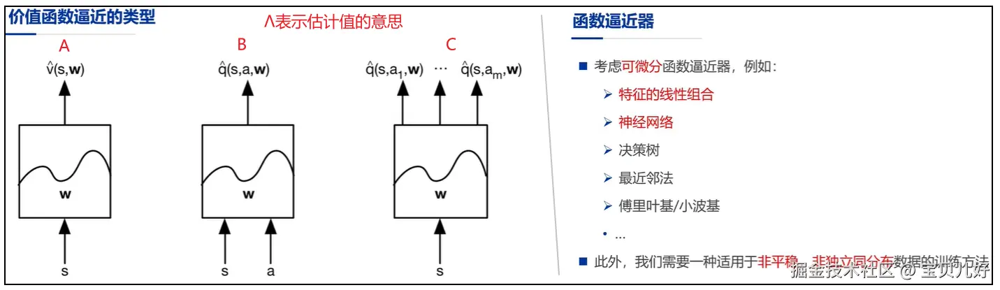 (2)从逼近函数的形式来看,我们倾向于使用可微分的逼近器,因为可微分工具在求导(也就是求最优值)时比较方便,即时再复杂,用链式法则就可以轻松求解嘛。