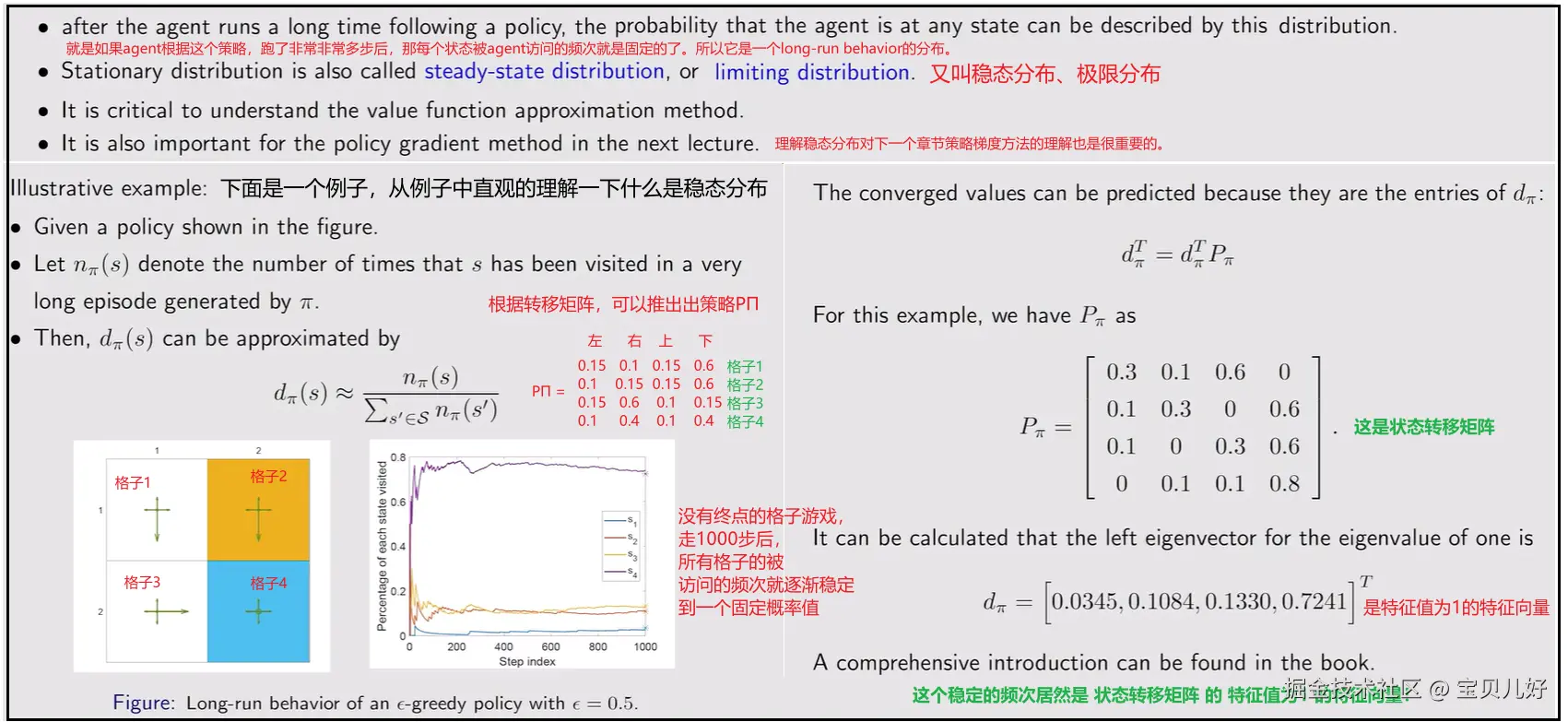 但是在实际问题中,这个假设有点武断。比如在网格游戏中,显然目标格子或者靠近目标格子的格子,这些格子的价值值应该是更大一些,所以我们应该给这些格子分配一个更大的权重,让其价值大一些。所以人们又假设了stationary distribution(平稳分布).