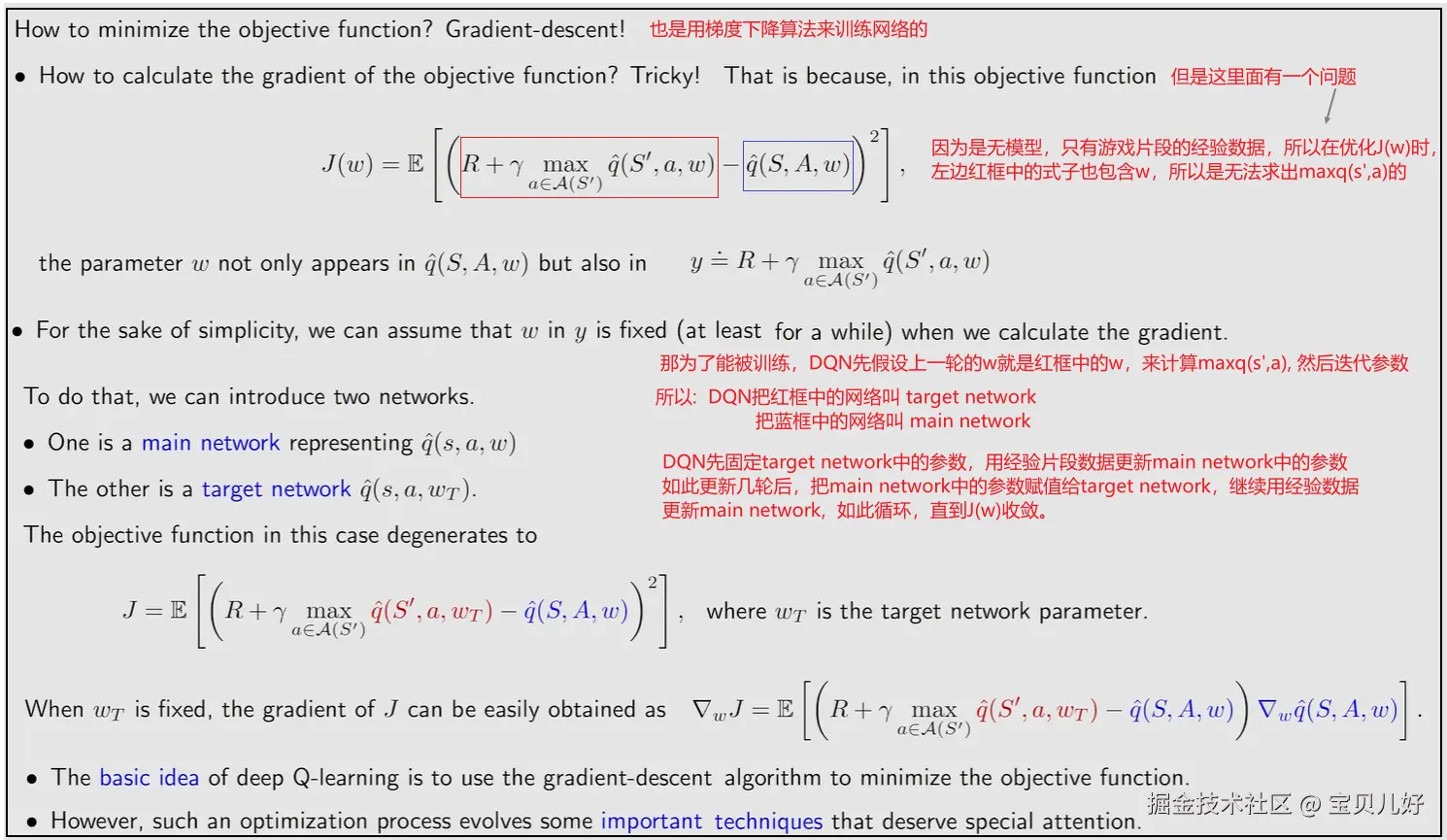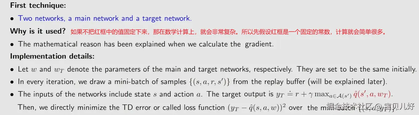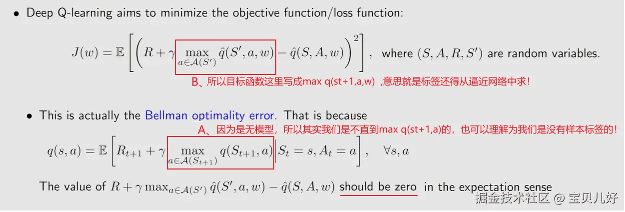 3、优化目标函数存在的问题上图就是一个悖论:因为是无模型,我们就不知道max q(st+1,a);不知道max q(st+1,a),J(w)红框部分(B处)就不知道;不知道B处,那就没法优化J(w)。