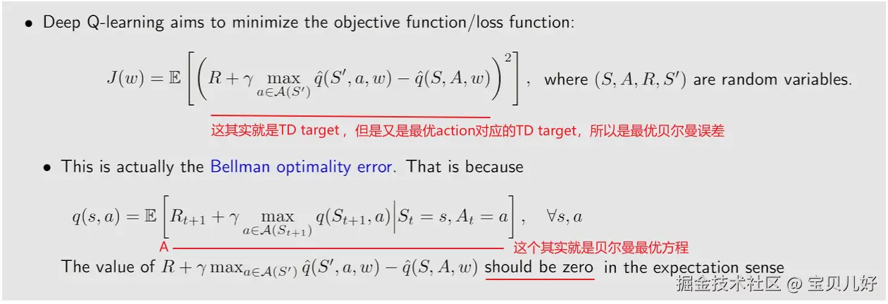 2、DQN的目标函数上图的J(w)就是DQN的目标函数,其实就是最优贝尔曼误差。