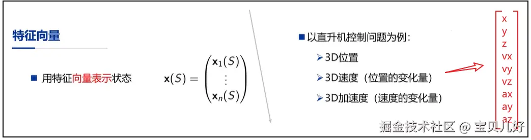 我们用深度强化学习解决的实际问题一般都是比较复杂的问题,所以我们一般用特征向量作为输入。所以当逼近函数的输入是s或者(s,a),那第一步就是考虑如何将s或者(s,a)表示成向量的形式:这个过程也叫状态的向量化过程,上图直升机例子中,我们用右边的这个9维的向量基本就可以表示直升机的当前状态s,当然,如果你要表示直升机的(s,a),那你在这个9维向量后面继续加动作向量即可。