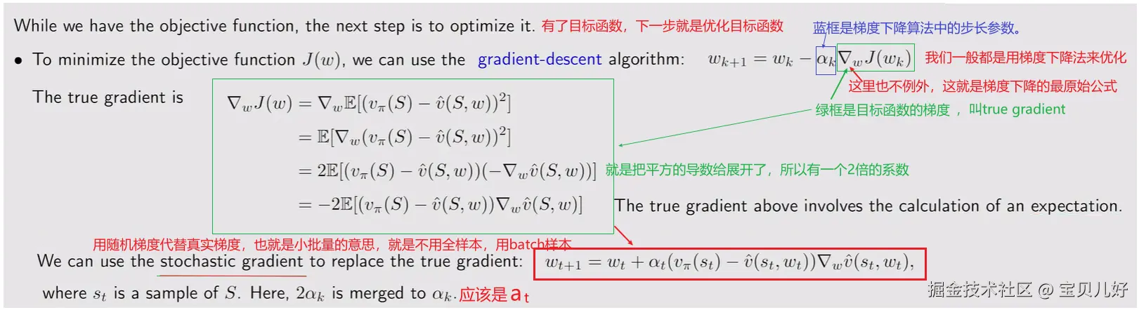其实在讲如何定义目标函数时,已经从目标函数的形式出发,讲了一些关于优化目标函数的知识点,这里再从优化算法gradient-descent algorithm的角度,再讲一遍优化目标函数的计算过程:上图红框中的式子就是梯度下降优化算法中的参数迭代过程,这个过程就是最最原始的梯度下降算法的最一般的形式,数学推导过程并不复杂。上图最大的细节就是把梯度下降计算过程中的步长参数、求期望中的常数2、以及去掉期望E的dп参数,统统合并到at中了。