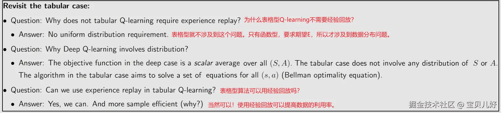 下面是表格型Q-learning和函数型Q-learning在数据分布方面的不同要求:tabular Q-learning当然也能用experience replay。因为tabular Q-learning也是off policy的算法,off policy算法是提前收集数据,而且不用care你的数据是什么策略下的数据、是整个episode还是只有一段Trajectory,就是不管是什么经验数据都是可以的。
