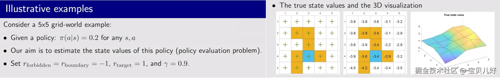 上图右边的表格是基于模型、用贝尔曼公式,求解出来的所有格子的价值值。右边的3D图是表格的可视化效果。